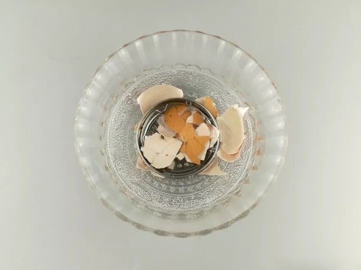 有些茶杯的茶垢比较久,都黑了,这个时候怎么办呢?还是用我们常见的食物和调料——鸡蛋壳和白醋。