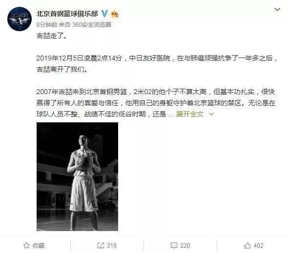 12月5日凌晨,首钢男篮前队长吉喆因肺癌医治无效去世,年仅33岁。