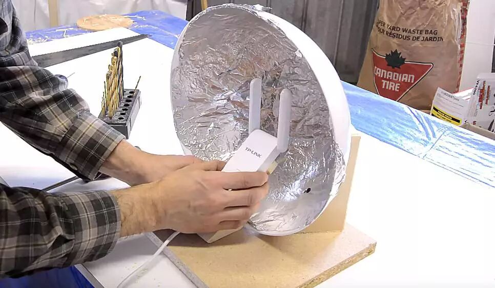 首先将易拉罐底部裁去,再剪开,最后套在路由器天线上,就完成啦!易拉罐内表面能够反射无线信号,可以加强天线发射和接收信号的能力。