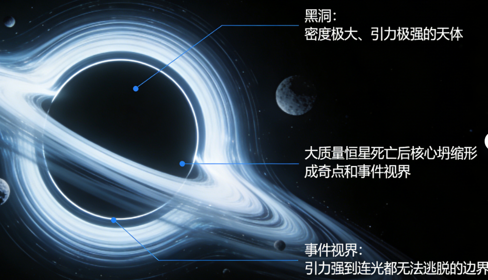 提到黑洞,很多人会以为它是一个“洞”,能吞噬一切,但其实黑洞是一种密度极大、引力极强的天体,它的引力强到连光都无法逃脱,所以我们无法直接看到它,只能通过它对周围天体的影响来判断它的存在。